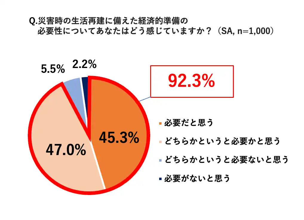 「災害時の生活再建に向けた経済的な備え(貯金や保険など)は必要だと思いますか」という質問に対し、「必要(45.3%)」、「どちらかといえば必要(47.0%)」となり9割以上(92.3%)が万一の際の経済的備えの重要性を認識していることがうかがえます。 |