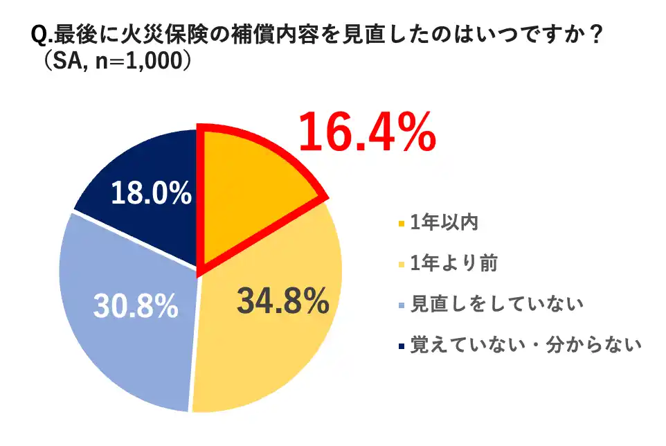 被災時の経済的備えにもつながる火災保険の補償内容について、「1年以内に見直した」と答えた人はわずかわずか16.4%と、2割にも満たないことが分かりました。 |