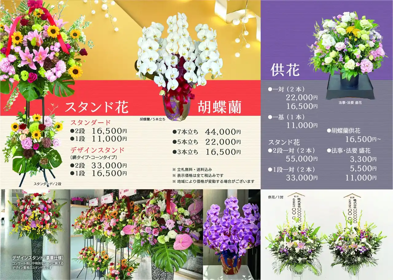 スタンド花は1段11,000円から、デザインスタンドは1段16,500円からの御案内となります。 |