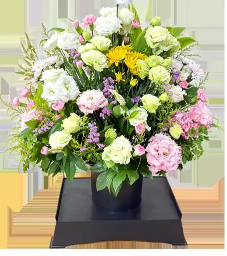 法事・法要の盛花の一例。3,300円からのお取り扱いとなります。 |