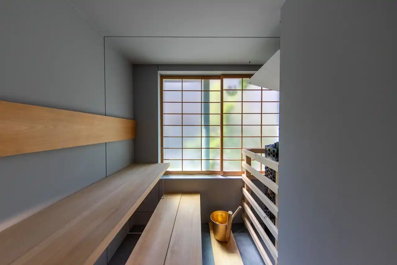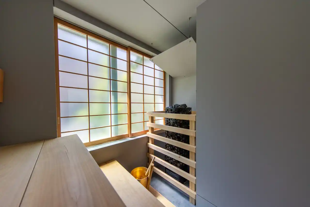 奈良・吉野産のヒノキを用い、鉋で仕上げた無塗装のベンチを設置。木の香りと静寂に包まれたプライベート空間は、まさに瞑想のためのサウナです。定期的に木肌を削り出すメンテナンスを行うことで、いつまでも新鮮な香りをお楽しみいただけます。窓辺には障子調の意匠を施し、都会にいながら和の趣と非日常感をご体験いただけます。 |