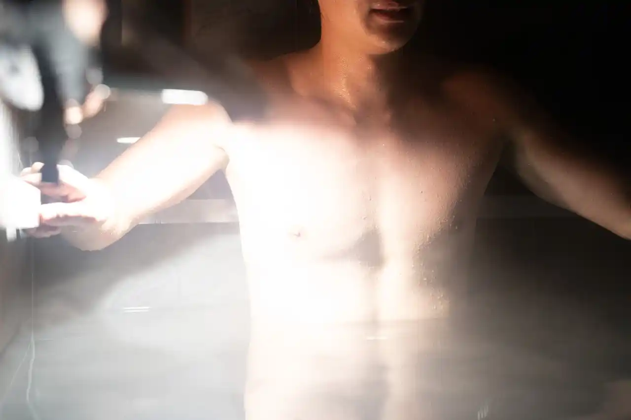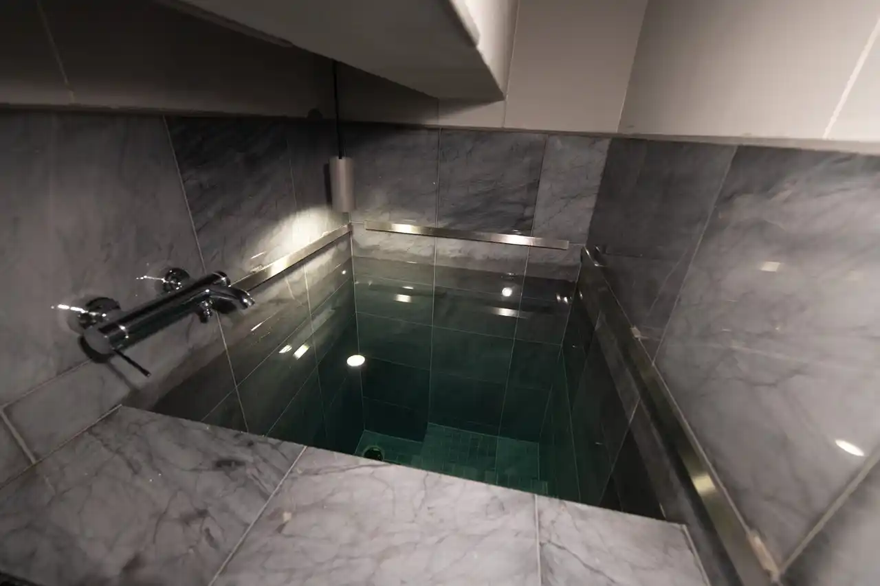 国内屈指の水深2mを誇るアイスバスは、まるで湖に飛び込むかのような全身没入型体験を提供し、「ととのい」効果を高めます。水風呂にはチラーを搭載しており、常時15℃になるよう水温を設定。サウナ室との温度バランスを考慮した最適な環境でご利用いただけます。 |