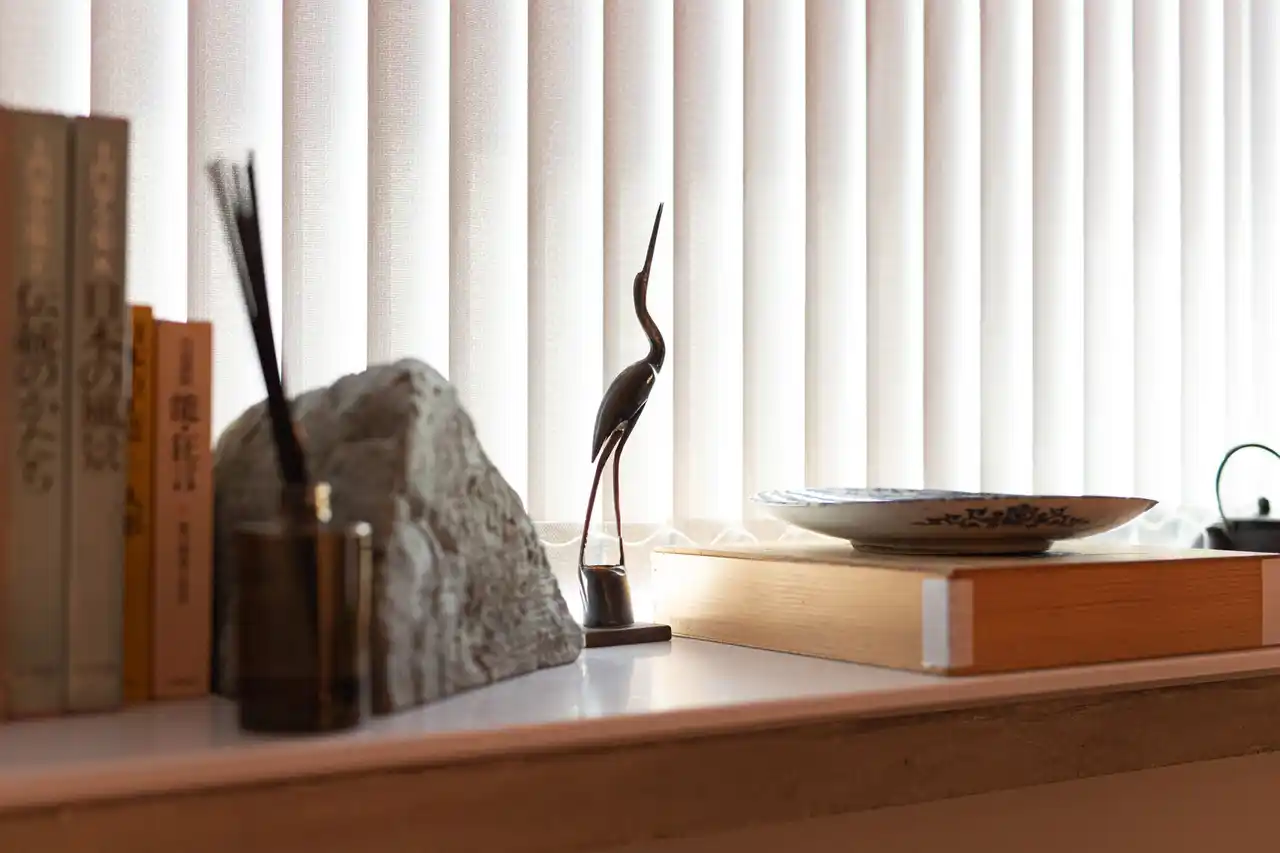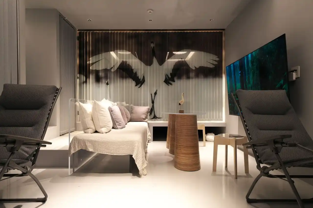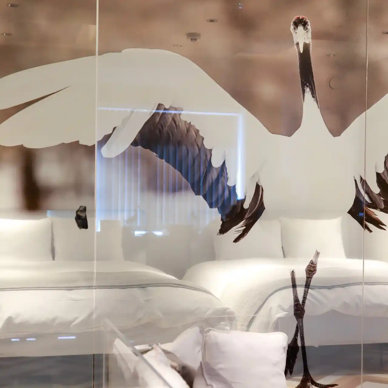 大きな鶴の写真が印象的なリビングスペースから廊下など、施設内の至る所に能面や和皿など40余点の古美術と現代アートを融合展示。時代を超えた造形美がミニマルな空間に溶け込み、一部の作品は購入も可能です。滞在そのものが、まるで美術鑑賞の旅のような体験へと変わります。 |
