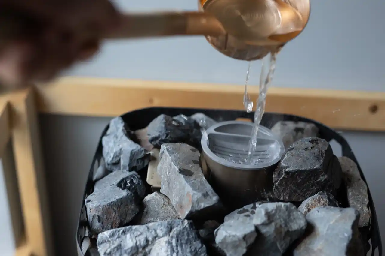 フィンランド・HELO社製の、日本国内では導入例の少ないサウナストーブを採用。サウナストーンの積載量は100kgを超えます。ストーブ中央にロウリュ時の水を蓄える筒状の独自機構を設けており、この筒内にロウリュ時の水3杯分程度を保持することで、湿度の高い状態を長時間維持でき、ロウリュをゆっくりとお楽しみいただけます。 |