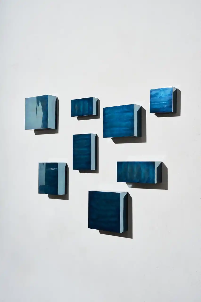 その作品は、勝木自身の手によって深い青色に輝きます。 |