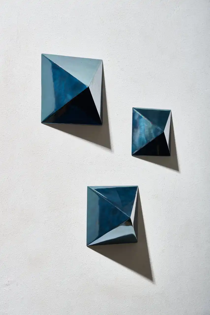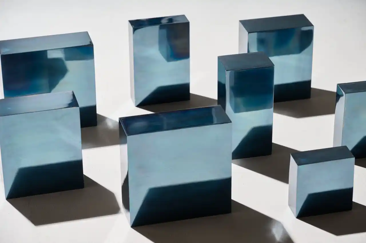 本展示では、近代的な建築を真上から俯瞰するような風景をイメージした『エッジのきいた形』をコンセプトにして制作された作品が並びます。人工的な形の中に写り込んだ海や空といった自然物が、勝木氏の独自な表現技法によって融和し、唯一無二の造形物として美しく輝きます。 |