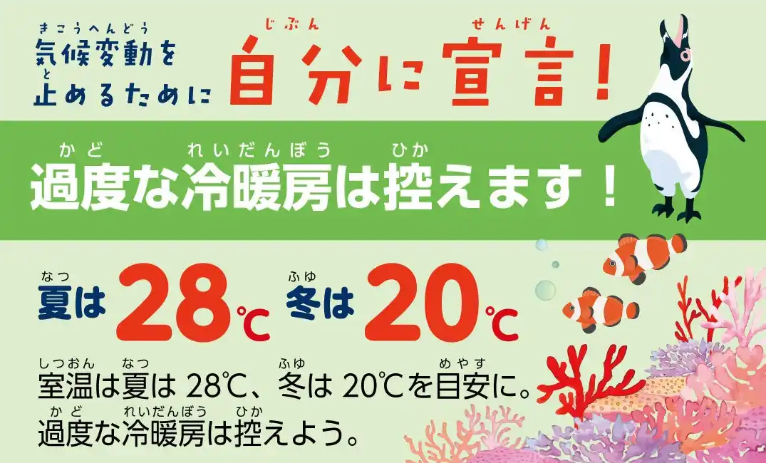 サンシャイン水族館で飼育展示しているサンゴやペンギンに焦点を当て、気候変動が生き物たちに与える影響を解説パネルでわかりやすく説明します。また、私たちが日常生活で実践できるアクションを日々意識できるよう、気候変動の抑制に貢献するためのアクションを書いた「宣言カード」をご来館の皆様にプレゼントします。 |