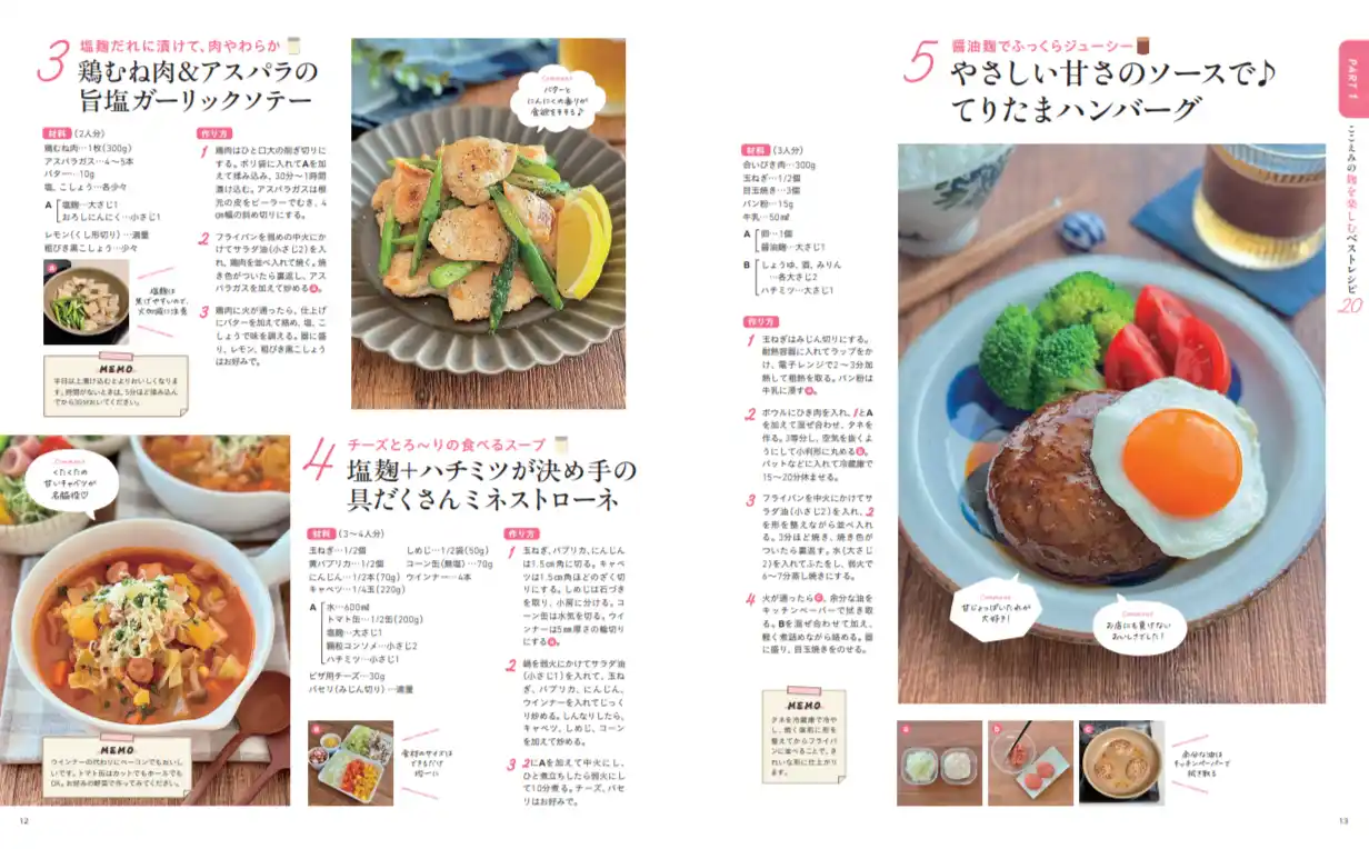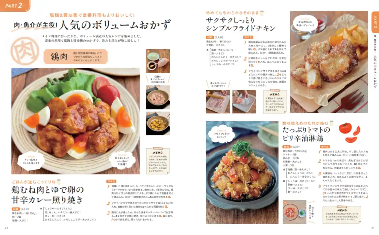Nadiaのアンケートでは「塩麹を持っている」という声が多く寄せられましたが、本書にも塩麹を活用したレシピが多数掲載されています。食べごたえのある肉おかずも豊富で、忙しい日でも満足感たっぷりの食卓が叶います。今回はその中から、家庭で作りやすく人気の高い「塩麹レシピ」3品をピックアップしてご紹介します。 |