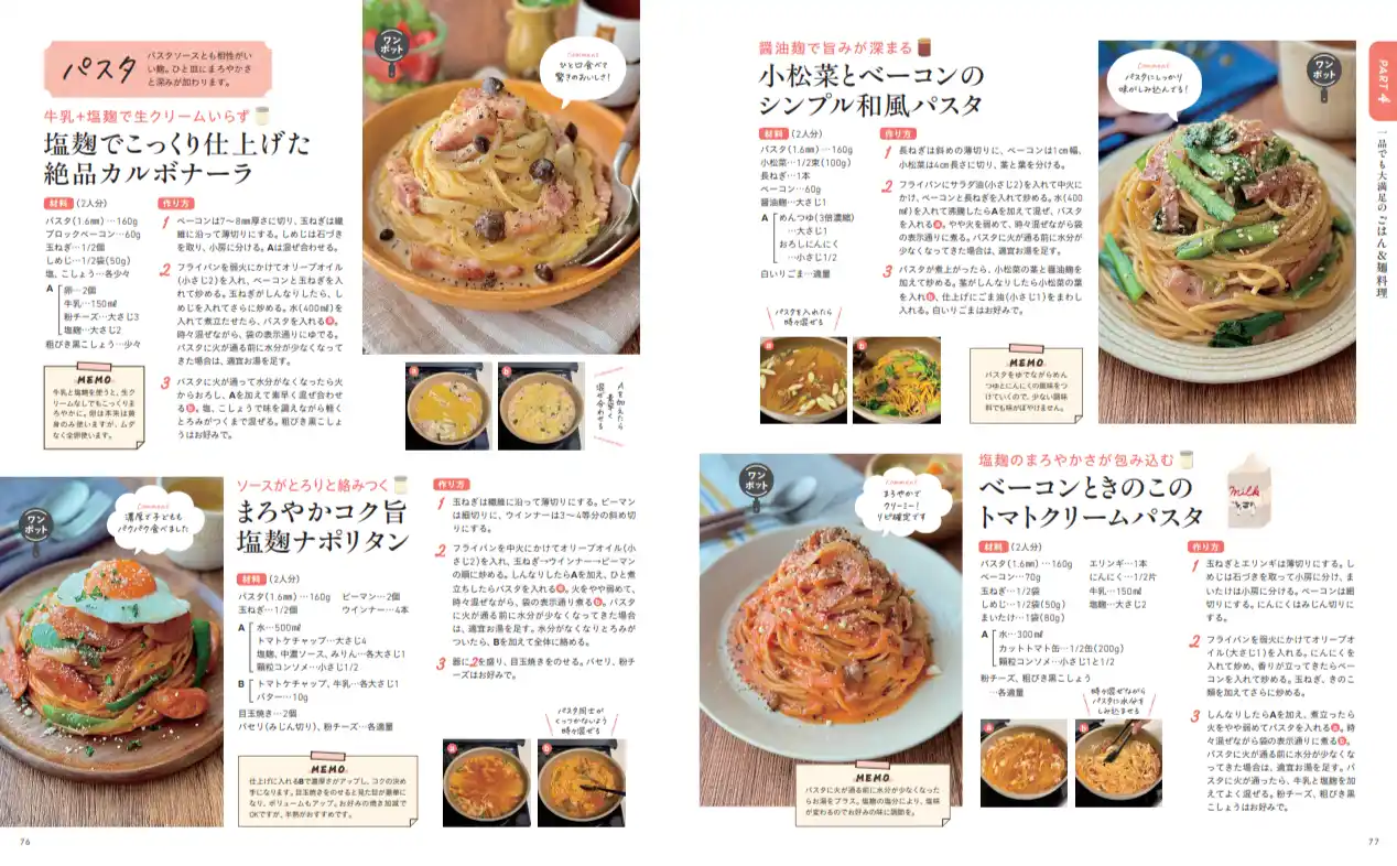 さらにうれしいのが、麹調味料のうま味を生かしたチャーハンや混ぜご飯、うどんやパスタまで、主食レシピも豊富に掲載されていること。忙しい日や時間がない日でも、これ一皿で満足できるのが魅力です。調味料として麹を活用することで、味付けはシンプルでも奥深い美味しさに仕上がります。 |