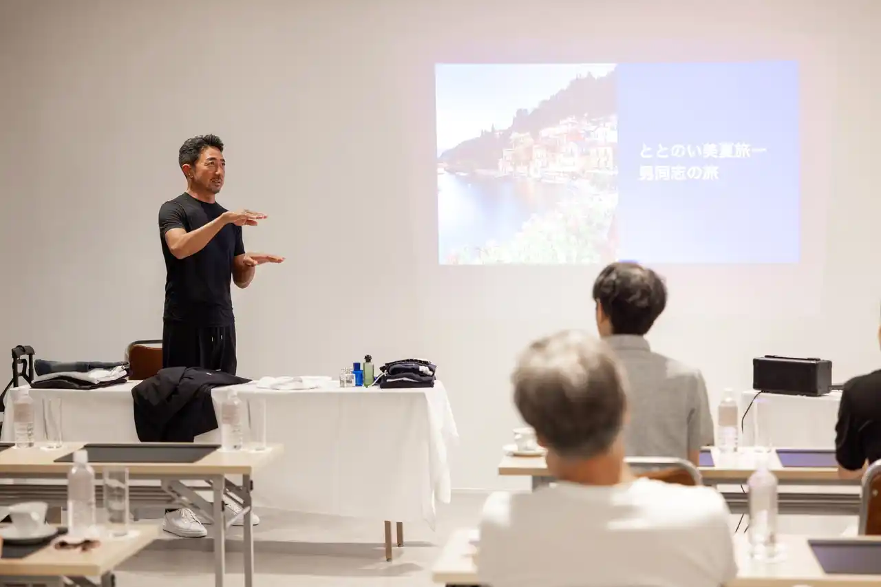 さらに、旅慣れた人にこそおすすめしたいスタイルとして「船旅」を挙げ、その理由としてドレスコードに基づいたファッションの所作が身につく点や、費用が一括で完結するコストパフォーマンスの良さを説明。旅先での香り・服装・所作など、すべてを含めて“旅の美学”を体現するような指南が展開されました。 |