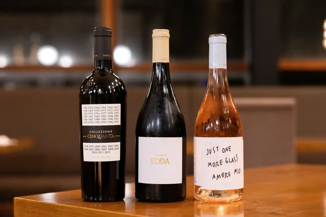 Cinquanta」(赤)の3銘柄のワインが用意されました。「サン・マルツァーノ」は、南イタリアのプーリア州で生産されている良質なワインで、コストパフォーマンスの高さが特徴です。「Tramari」は、毎年アーティストとコラボレートしているロゼワインで、2024年ヴィンテージのラベルには『愛』をテーマにしたメッセージが記されています。「Edda」は、アロマティックな香りがするパンチの効いた白ワインとなっており、魚介料理との相性抜群です。「Collezione Cinquanta」は、創立50周年を記念してつくられた特別な赤ワインで、欧州では様々な賞を獲得しています。 |