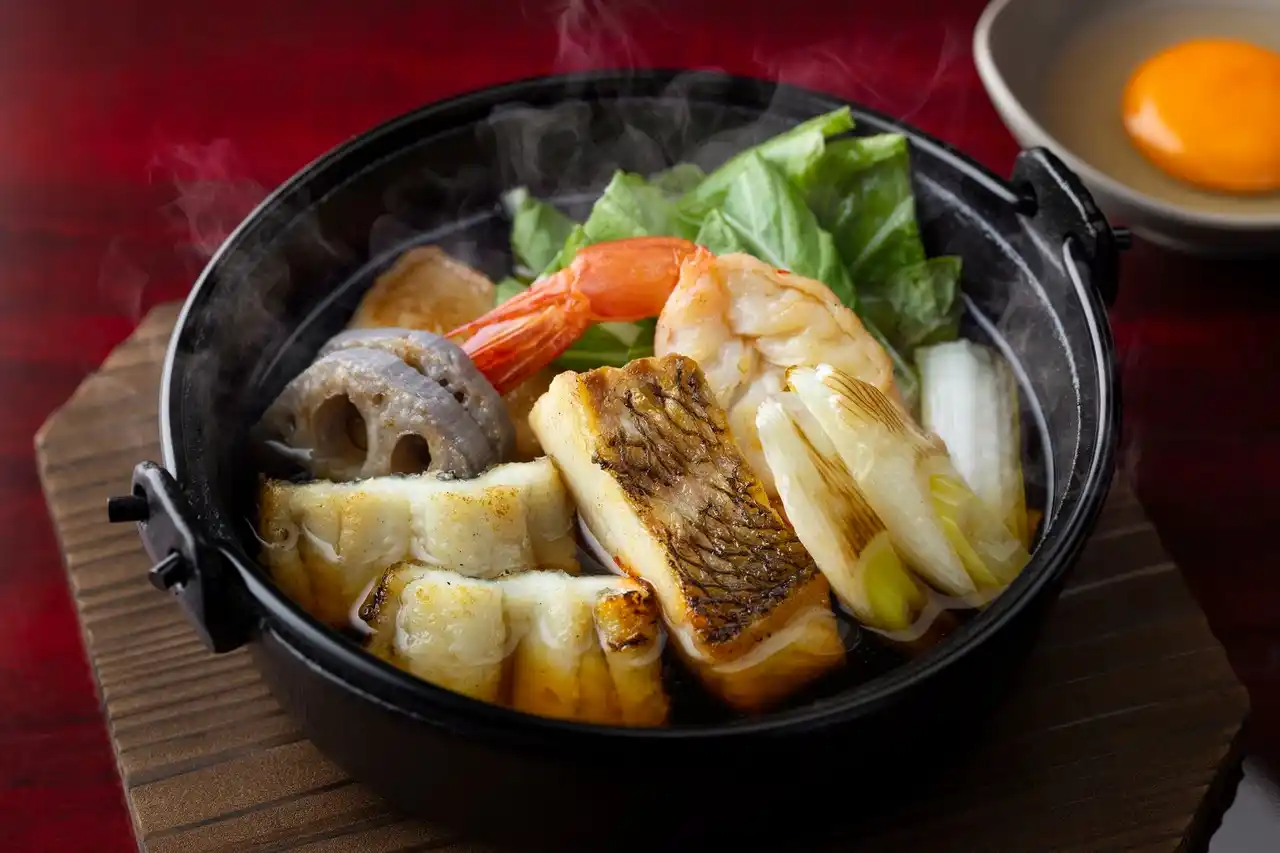 魚すきとは、牛肉の代わりに鯛や鰆(さわら)などの新鮮な魚を使い、秘伝の甘辛い出汁で煮込む、大阪ならではの伝統的な鍋料理です。すき焼きと同じように、溶き卵につけてまろやかにして食べるのが特徴です。 |