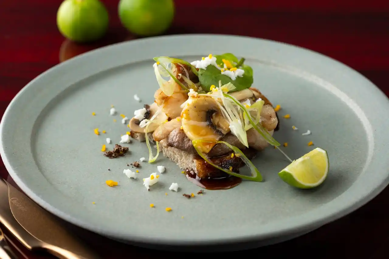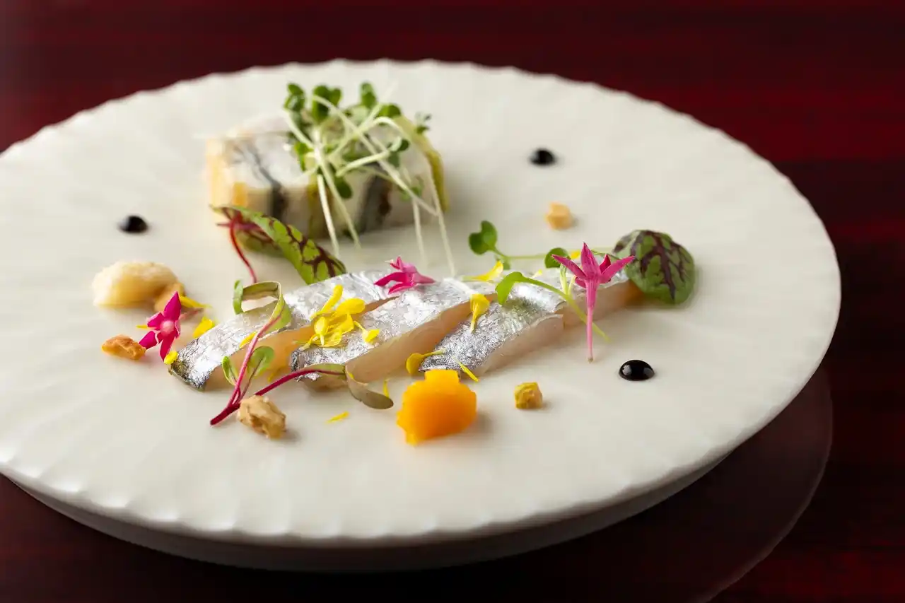 冷前菜では、藤井寺市で育てられた「美陵鰻(みささぎうなぎ)」などを用いた一皿を、大阪産素材で作るアロマドレッシングとともにご用意。温前菜には、松原市を拠点に生産している「河内鴨」を鴨肉の旨みと食感を楽しめるスモーブローでお召し上がりいただきます。魚料理では大阪名物として愛されてきた、丸萬本家の「魚すき」に敬意を表し、「魚のすきやき」の魅力を大阪の食文化として後世に伝えていく一助として、鉄板焼きで「魚すき」を表現いたしました。ソテーした魚や海老をだしで炊き、卵をつけてお召し上がりください。