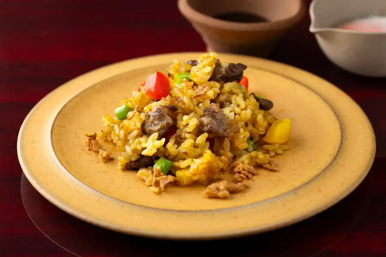 釜炊きご飯の肉入りドライカレー、温度玉子添え |