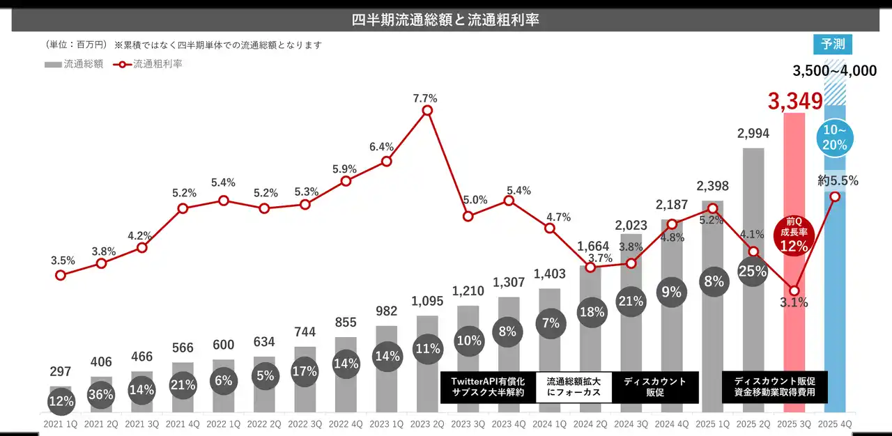 2025年9月期第3四半期においては前四半期対比112%、流通総額約34億円へ到達いたしました。流通総額1,000億達成に向けて、「3万円以下のto C現金支払い」を、1.広告領域 2.人材領域 3.金融領域の3軸にて網羅を目指してまいります。各領域における取り組みを強化し、2027年9月期に掲げている流通総額1,000億円を達成することで、圧倒的低手数料を実現し、より多くの企業様にご利用いただけるよう、更に邁進してまいります。 |