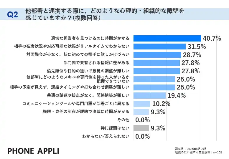 「他部署と仕事をする際に、どのような心理的・組織的な障壁を感じていますか」という設問(複数回答)では、「適切な担当者を見つけるのに時間がかかる」が40.7%で最多となりました。次いで「相手の在席状況や対応可能な状態がリアルタイムでわからない」(31.5%)、「対面機会が少なく、特に初めての相手に話しかけづらい」(28.7%)と続き、円滑なコミュニケーションを阻む要因が浮き彫りになりました。 |