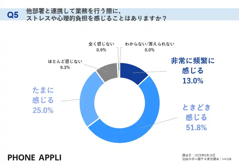「他部署と連携して業務を行う際に、ストレスや心理的負担を感じることはありますか」という設問に対し、「非常に頻繁に感じる」が13.0%、「ときどき感じる」が51.8%、「たまに感じる」が25.0%となり、合計89.8%もの従業員が何らかのストレスや心理的負担を感じていることが明らかになりました。 |
