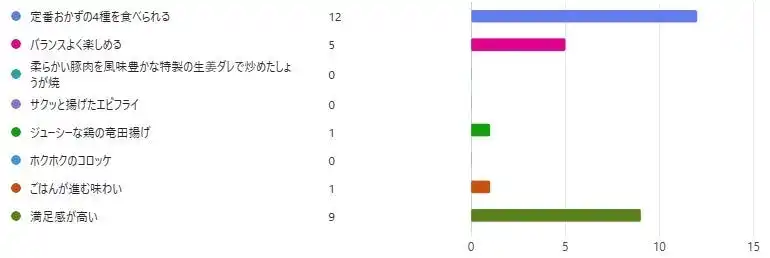 最も多くの票を集めたのは『定番おかずの4種を食べられる』というポイントでした。2位は『満足度が高い』、3位は『バランスよく楽しめる』でした。やよい軒の定番のおかずが4種食べられる欲ばりな一皿をぜひお楽しみください。 |