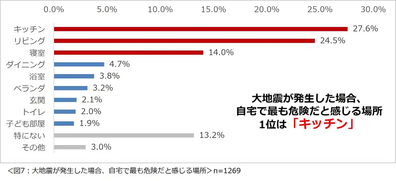 | 「大地震が発生した場合、自宅で最も危険だと感じる場所はどこですか?」と尋ねたところ、1位「キッチン」(27.6%)、2位「リビング」(24.5%)、3位「寝室」(14%)という結果になりました。(図7) | |||||||||||