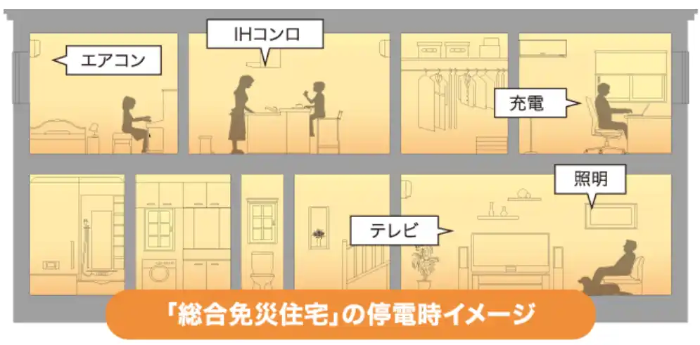 | 大容量太陽光パネルで創った電気を蓄電池に充電し、停電時も最大5.5kVAまで家中に供給。照明を点けたり、スマートフォンの充電などができるのはもちろん、小さなお子さまのいるご家庭でも、電気ケトルでミルクを作ったり、哺乳瓶を煮沸消毒したりと、ほぼ普段通り(※3)の生活を送ることができます。 | |||||||||||