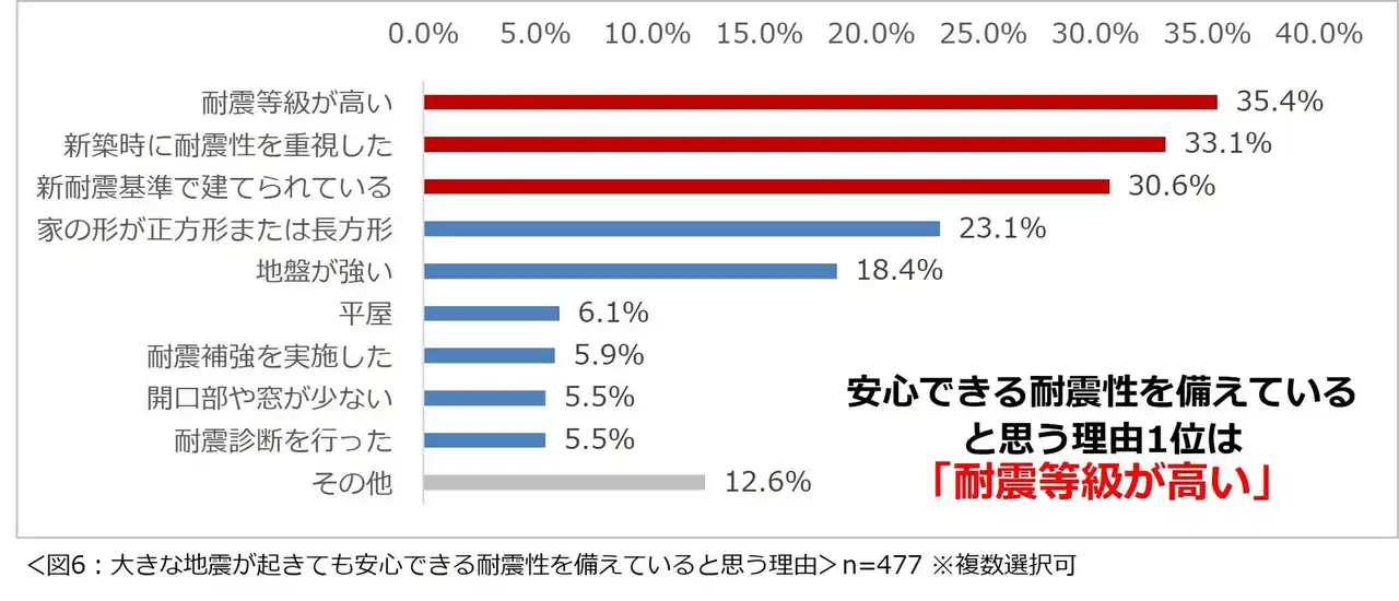 | 現在の自宅は、大きな地震が起きても安心できる耐震性を備えていると思っている477名に、その理由について尋ねたところ、1位「耐震等級が高い」(35.4%)、2位「新築時に耐震性を重視した」(33.1%)、3位「新耐震基準で建てられている」(30.6%)という結果になりました。(図6) | |||||||||||