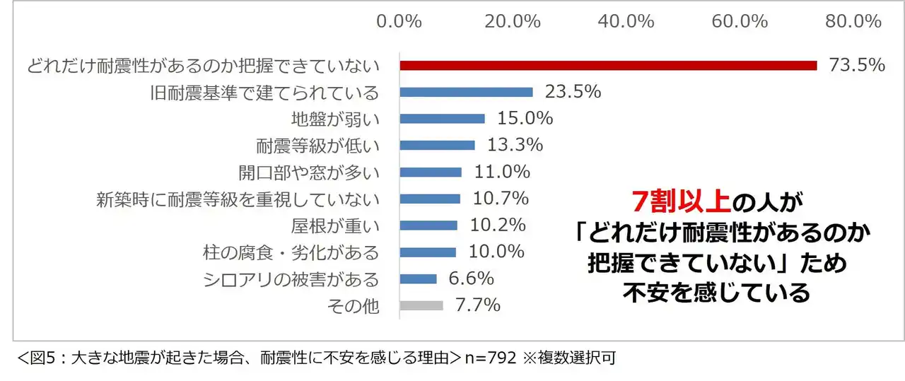 | 大きな地震が起きた場合、現在の自宅は安心できる耐震性を備えていないと思っている792名に、その理由について尋ねたところ、「どれだけ耐震性があるのか把握できていない」という回答が最も多く73.5%という結果になりました。(図5) | |||||||||||