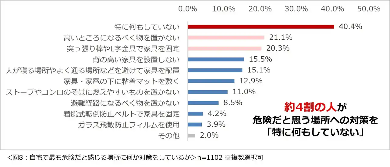 | なお、危険だと感じる場所への対策方法について尋ねたところ、1位「高いところになるべく物を置かない」(21.1%)、2位「突っ張り棒やL字金具で家具を固定」(20.3%)と回答が続いた一方、何も対策をしていない人も約4割いました。(図8) | |||||||||||