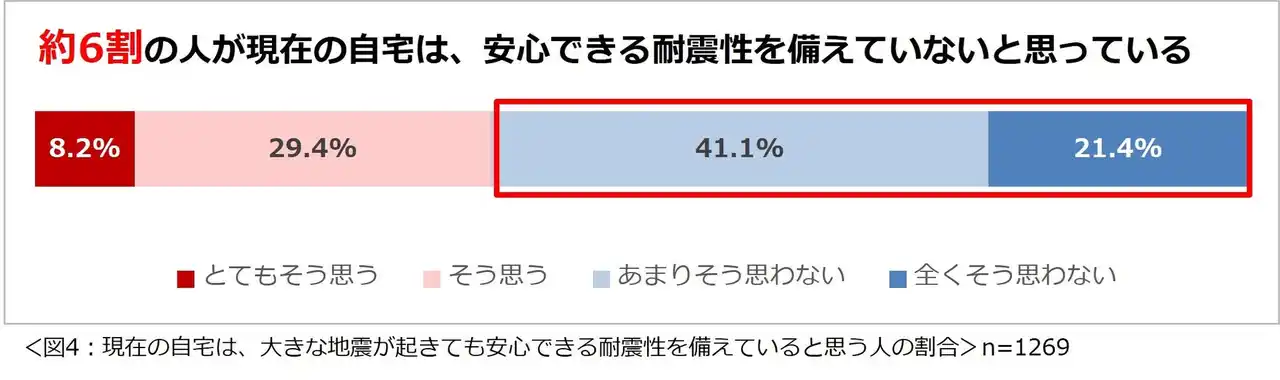 約6割が、現在の自宅は、大きな地震が起きても安心できる耐震性を備えていないと思っている。