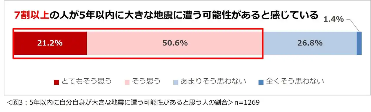 5年以内に自分自身が大きな地震に遭う可能性があると思っている人は7割以上。