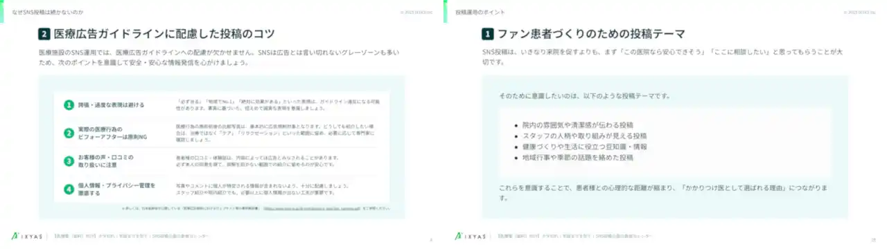 医療広告ガイドラインに準拠した発信設計 医療業界では、広告・表現に関するガイドラインが厳格であり、発信を躊躇するケースも少なくありません。本資料では、ガイドラインに配慮した投稿作成のポイントを4つに整理しています。 |