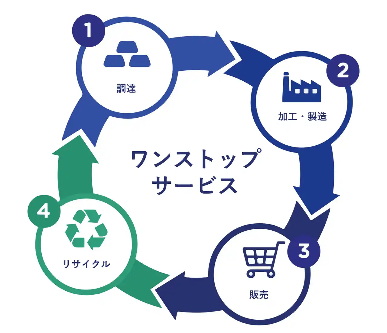 田中貴金属では、貴金属リサイクルにおいて、独自のリサイクル技術とワンストップでのトータルソリューション(ワンストップサービス)を提供しています。貴金属の「調達」から「加工・製造」「販売」、そして「リサイクル」に至るまで、すべての工程を田中貴金属だけで対応できます。これは創業以来培ってきた調達ルート、高度な技術力、製品開発力、研究体制、国内外のネットワークが支える総合力によるものです。ワンストップサービスを通じて、資源の効率的な回収を実現し、サプライチェーンの強靭性を高めることで、循環型経済の推進に貢献しています。今後も、次世代の半導体製造を支える長期的なパートナーとして、持続可能な産業の発展に寄与してまいります。 |