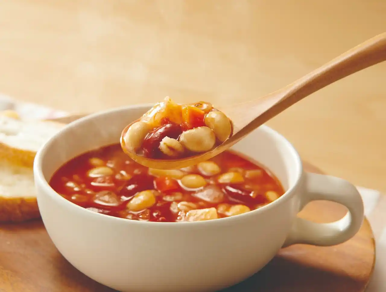 ・「豆・野菜・押麦」が入った具だくさんのたべるスープ。 |
