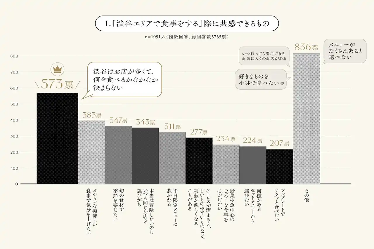渋谷エリアで食事をする際に共感できるものを全てお選びください。(n=1000) |