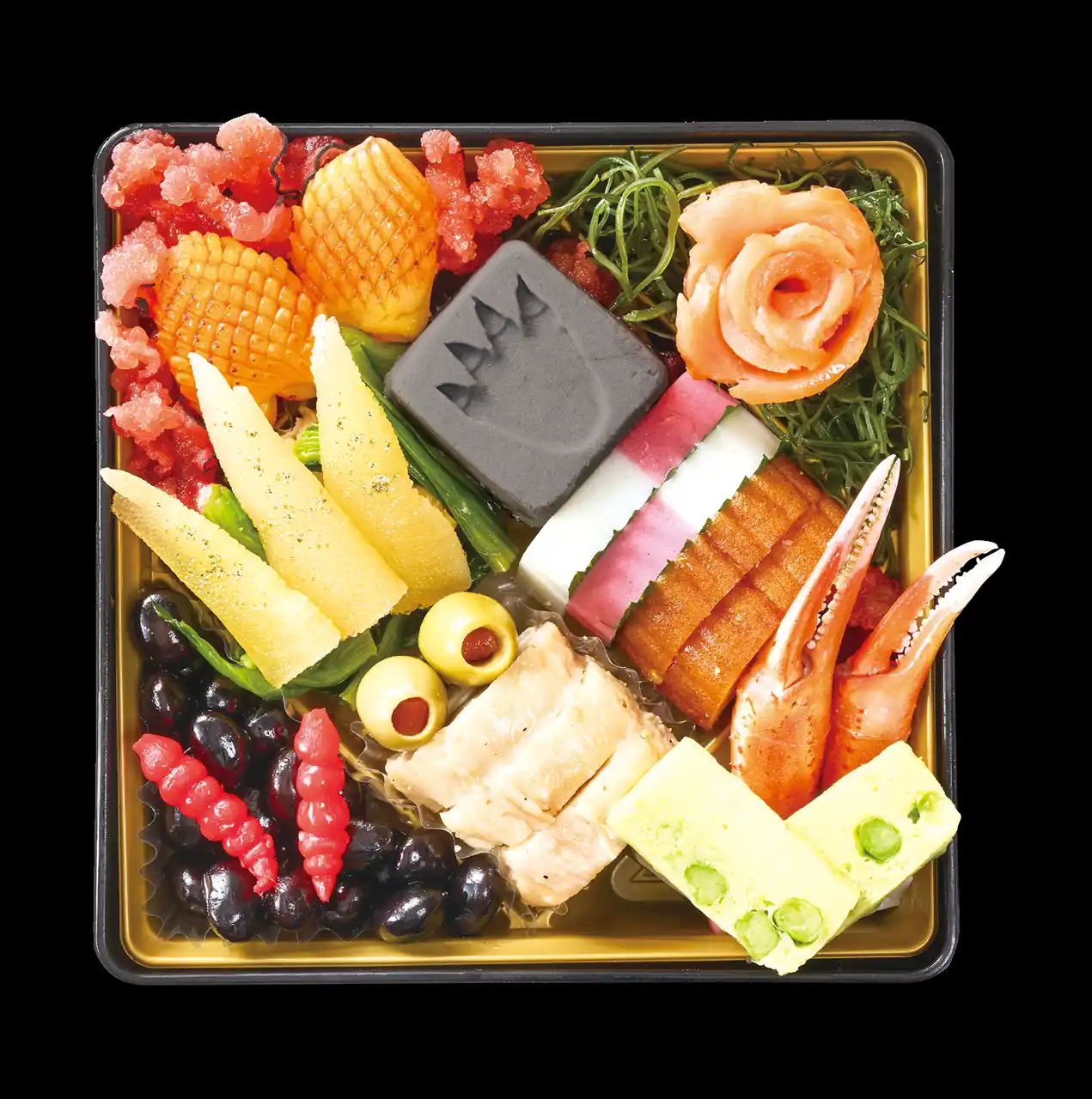 ゴジラ作品をモチーフにした和洋中の三段重 |
