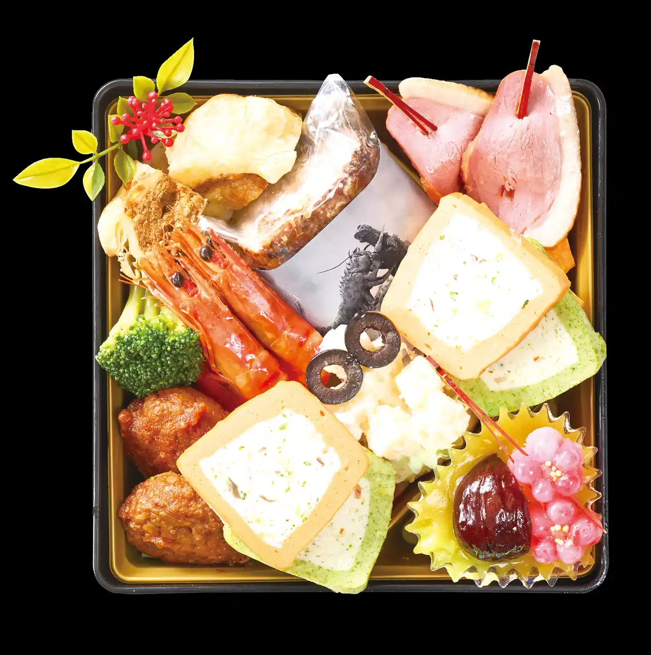 2026年版のおせちは、『シン・ゴジラ』(2016)や『モスラ』(1996)など、歴代の東宝特撮作品の中から周年を迎える作品にスポットライトを当て、和洋中の豪華な三段重おせちを開発。各作品をモチーフとしたオリジナル料理を彩り豊かに盛り付け、趣向を凝らした「ゴジラおせち2026」をお届けします。ここでしか手に入らない4つの特典のほか、数量限定の【DX(デラックス)版】には、『ゴジラ・エビラ・モスラ南海の大決闘』(1966)のゴジラとエビラの海上戦の情景オーナメントが付属。2026年の新しい年を楽しく華やかに演出します。 |