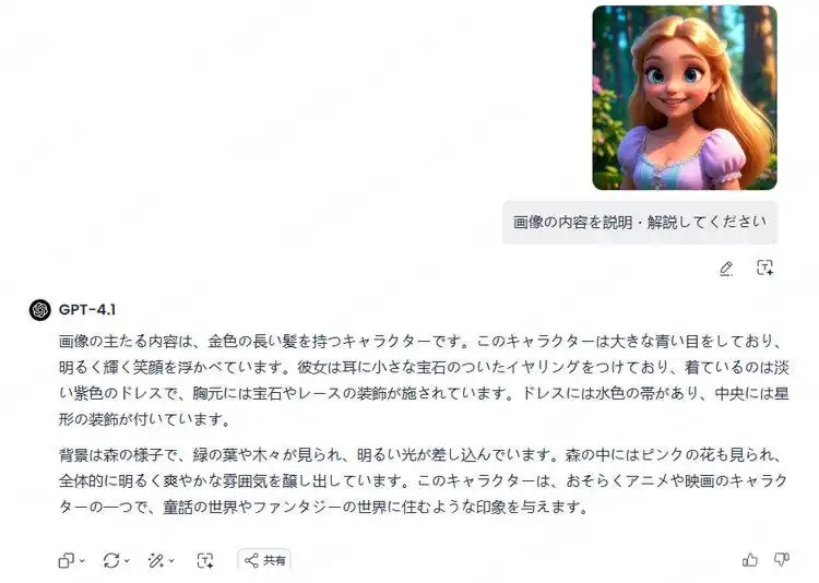 画像内容の説明:アップロードした写真の内容をAIが自動で解説。 |