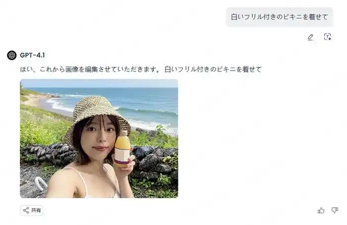 画像加工:例えば「赤いドレスに変えて」「帽子を追加して」といった簡単な指示で、写真を自由に編集可能。 |