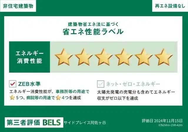 環境や人に配慮した持続可能な建物を提供するため、「SIDEPLACE ASAGAYA」では、BELS認証のレベル6を取得しています。この認証を取得するには、建物のエネルギー消費を省エネ基準より50%以上削減する必要があり、これにより環境への負担を大幅に軽減できます。 |