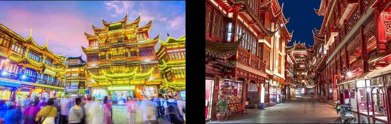 上海城隍廟観光エリア 上海城隍廟観光エリアは、東黄浦区の旧市街にある観光・ショッピング・グルメの人気スポット。豫園と老城隍廟の2大名所があり、上海の伝統や本場グルメを楽しめます。夜には古い建物がライトアップされ、美しい景観が広がります。 |