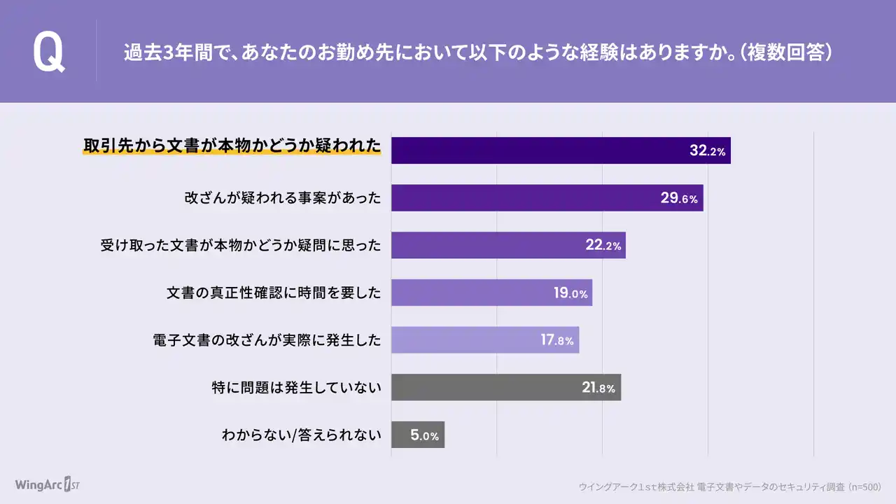 「Q.過去3年間で、あなたのお勤め先において以下のような経験はありますか。(複数回答)」(n=500)と質問したところ、「取引先から文書が本物かどうか疑われた」が32.2%、「改ざんが疑われる事案があった」が29.6%、「受け取った文書が本物かどうか疑問に思った」が22.2%という回答となりました。 |