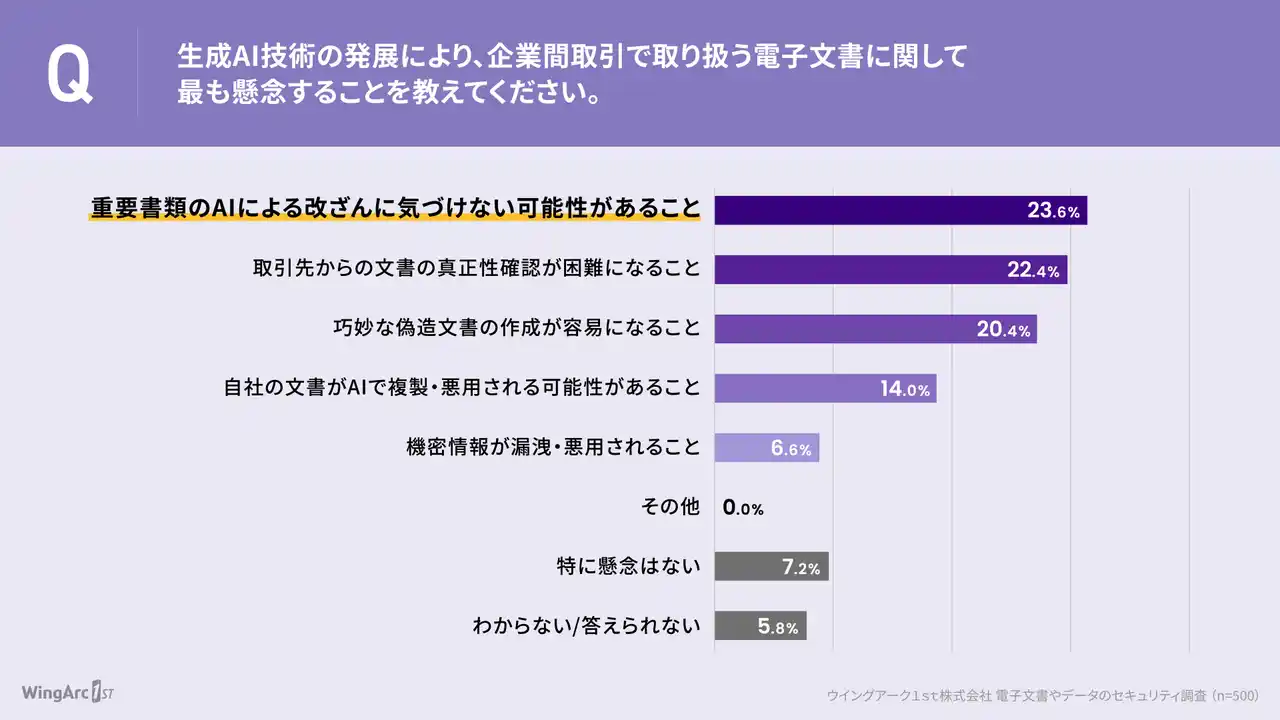 「Q.生成AI技術の発展により、企業間取引で取り扱う電子文書に関して最も懸念することを教えてください。」(n=500)と質問したところ、「重要書類のAIによる改ざんに気づけない可能性があること」が23.6%、「取引先からの文書の真正性確認が困難になること」が22.4%、「巧妙な偽造文書の作成が容易になること」が20.4%という回答となりました。 |