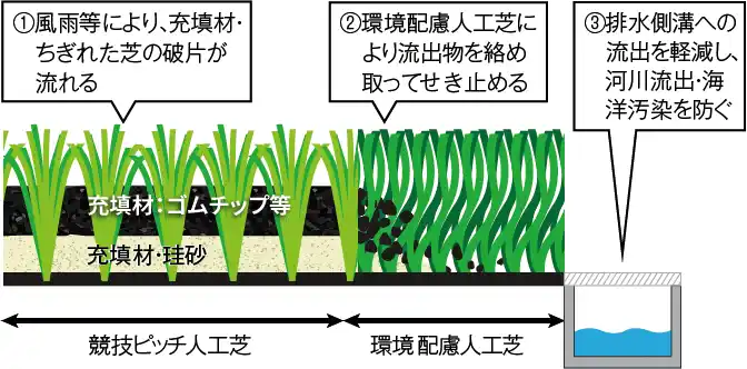 | 今回導入した環境配慮型人工芝「GEO-TURF KHターフ」は、競技エリアの外周に敷設することで、充填チップ材や破断パイルなどのマイクロプラスチックの排水側溝への流出を軽減し、河川や海洋の汚染を防ぐ、環境保全に特化した人工芝です。芝葉の部分である捲縮(けんしゅく)パイルの目付の密度を上げ、パイル形状をV字型にすることで耐久性と起立性を高めています。また、競技エリアの人工芝の充填層と芝丈を合わせることで充填チップ材や破断パイルの流出を抑制できます。 | |||