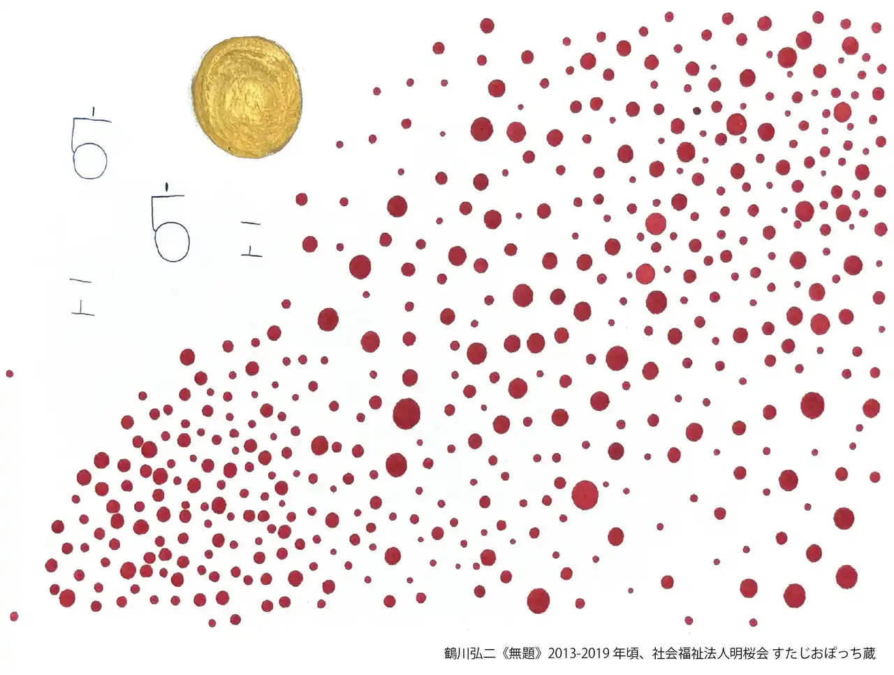 1973年 兵庫県生まれ。紙面に点在する無数の赤い丸は、油性ペンをにじませインクが浸透してできた染みである。点の隙間を浮遊するかのように、デフォルメされた文字や数字、聞こえてきた音や言葉、自身の感情が書き込まれ、創作の静かな時間と日常のひとこまを想像させる。近年の主な展示に、「アール・ブリュット -日本人と自然- BEYOND」(ボーダレス・アートミュージアムNO-MA[滋賀]2022年)などがある。 |