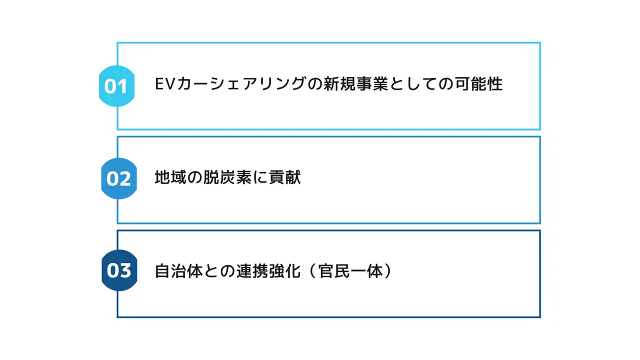 将来的には、EVカーシェアリングと他の脱炭素施策を組み合わせたエネルギーの統合プラットフォームの構築・提供を通じて、自治体との連携を一層強化し、地域全体の地産地消を促進するエネルギーの地域エコシステム構築を支援してまいります。 |