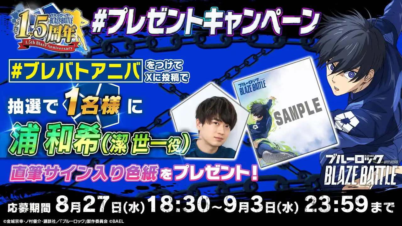 生放送中にハッシュタグ「#ブレバトアニバ」をつけてXに投稿していただいた方の中から、抽選で1名様に、ゲスト・浦和希さん(潔 世一役)の直筆サイン色紙をプレゼントいたします。 |
