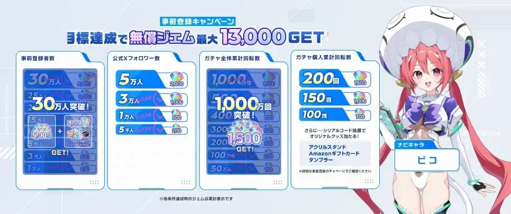 | 現在実施中の事前登録キャンペーンでは、事前登録者数が30万人突破・公式Xフォロワー3万人・ガチャ累計回転数1,000万回達成したことで「無償ジェム10,500個」+「豪華アイテム」の配布が決定いたしました! | |||