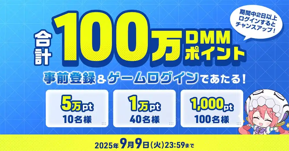 | リリースまでに事前登録+リリース後のゲームログインをした方の中から抽選で合計150名様に、合計100万DMMポイントがあたるキャンペーンを開催いたします。期間中2日以上ゲームにログインをすると、さらに当選チャンスがアップしますので、リリース後も是非続けてご参加ください! | |||