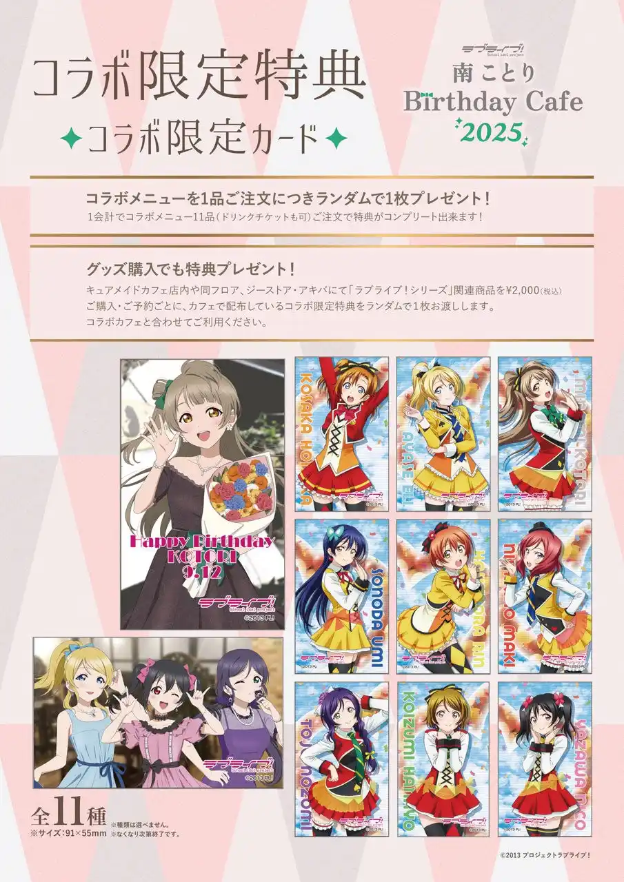 共通特典として、カフェにて「ラブライブ!シリーズ」関連商品を3,000(税)ご購入ごとに「ラブライブ!」南 ことり Birthday Cafe 2025とコラボした特別なPRカードをプレゼントいたします。 |