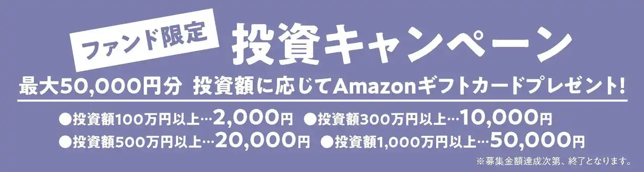 本ファンド投資額に応じて、最大50,000円分のAmazonギフト券をプレゼントいたします。詳しくは公式サイトをご覧ください。 |