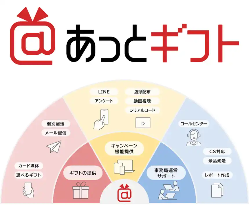 「あっとギフト」は、QUOカードPayやAmazonギフトカードをはじめとする様々なデジタルギフトの調達からキャンペーン機能の提供、CS対応などの事務局運営まで、デジタルギフトを使ったあらゆる施策をワンストップでサポートするデジタルギフトサービスです。 |